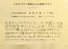 ♪レッスンのことを教えてください。いつもたくさんほめてくれるからうれしいです。お母さまのコメント:レッスンでは、テキストの絵や歌詞からも曲のイメージを膨らませて、「その曲らしい音」で弾けるように6才にも分かりやすく伝えてくださいます。キレ...